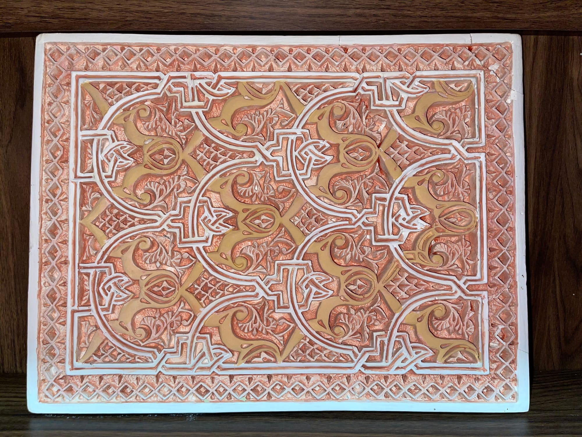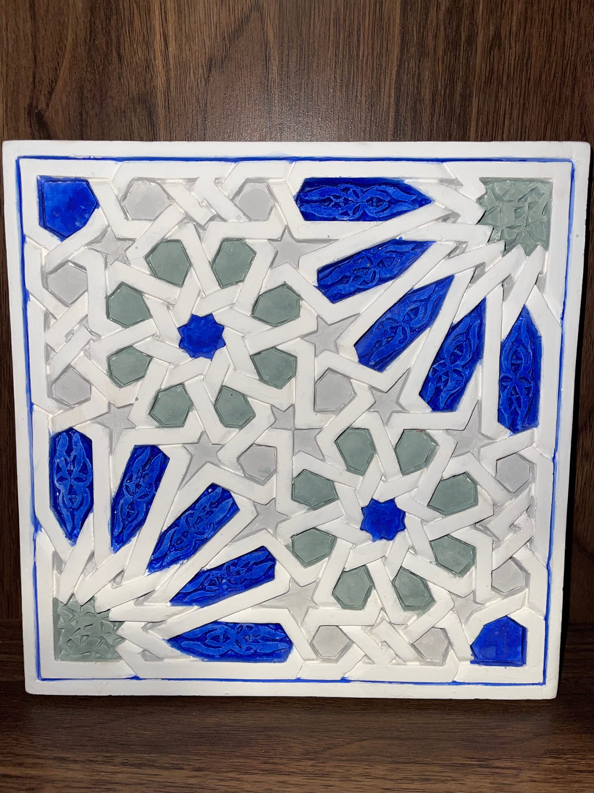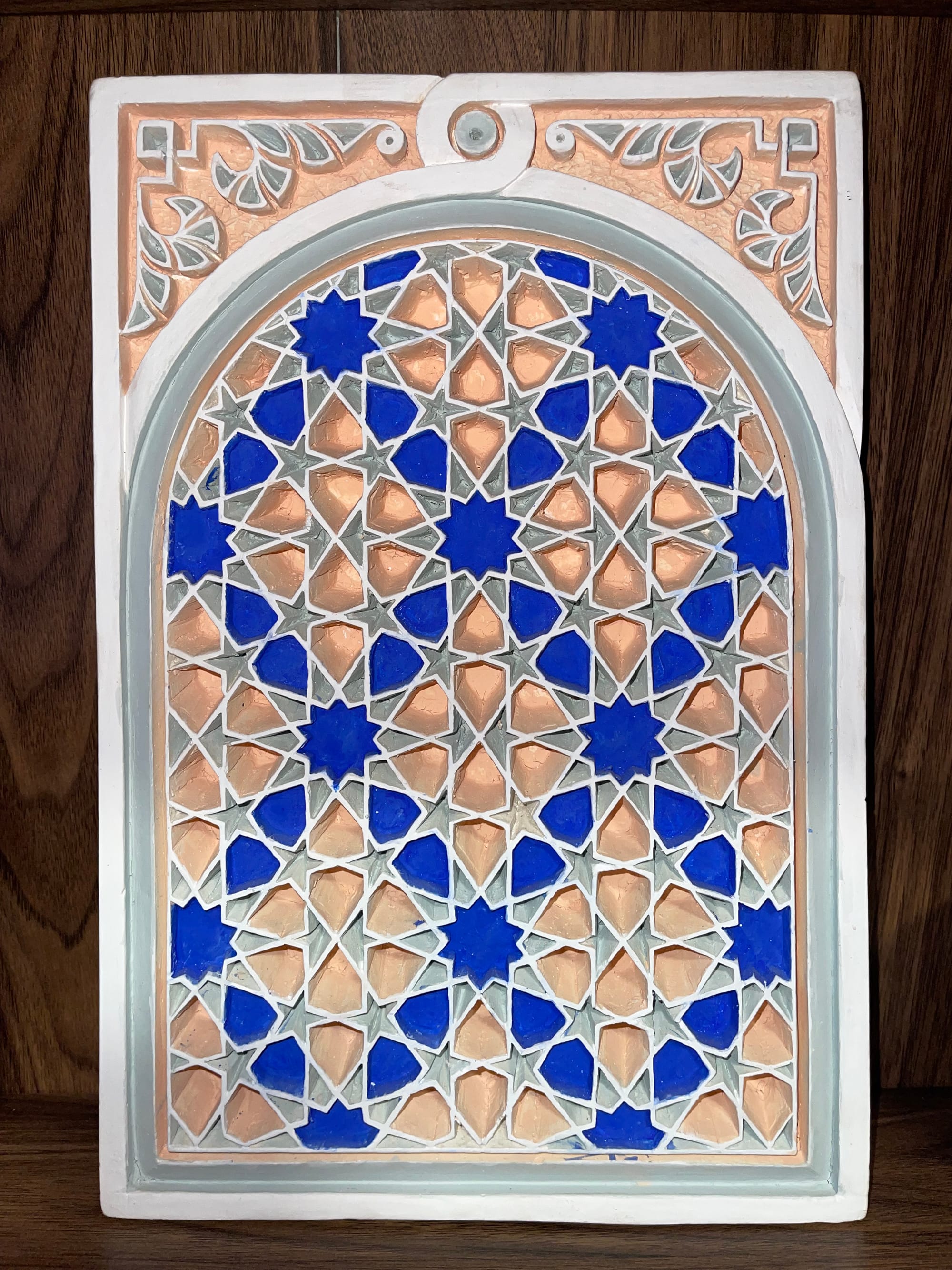 But the real find in Marrakech was the terracotta tiles. I bought three of them from a vendor in the medina after a mosque tour with a hired guide. Every mosque we entered stopped me cold—the woodwork, the ceramic, the zellige tilework, all of it impossibly intricate, patterns within patterns within patterns until your eyes couldn't track them anymore. The tiles I bought echo that geometry: one with Islamic star patterns in deep cobalt and warm terracotta, another with arabesque flourishes in earth tones that seem to glow in certain light, a third with interlocking stars in cobalt and sage green. They're meant for walls, not floors. Purely decorative. I carried them with me through the rest of the trip wrapped in a scarf, constantly checking that they hadn't cracked.