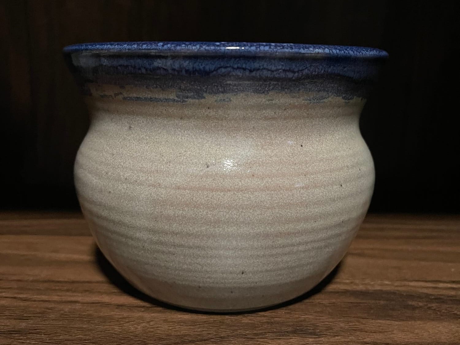 The bowl I chose was about eight inches across, shallow enough to use for serving but deep enough to be practical. The clay body was a grayish-green, the color of lichen on stone, with a subtle texture that invited touch. A blue rim circled the edge, a simple detail that elevated the whole piece, the contrast between colors drawing the eye upward. The inside had the slight spiral marks of the wheel, the trace of the potter's fingers left visible rather than smoothed away. When I picked it up, it fit in my hands like it had been made for them.